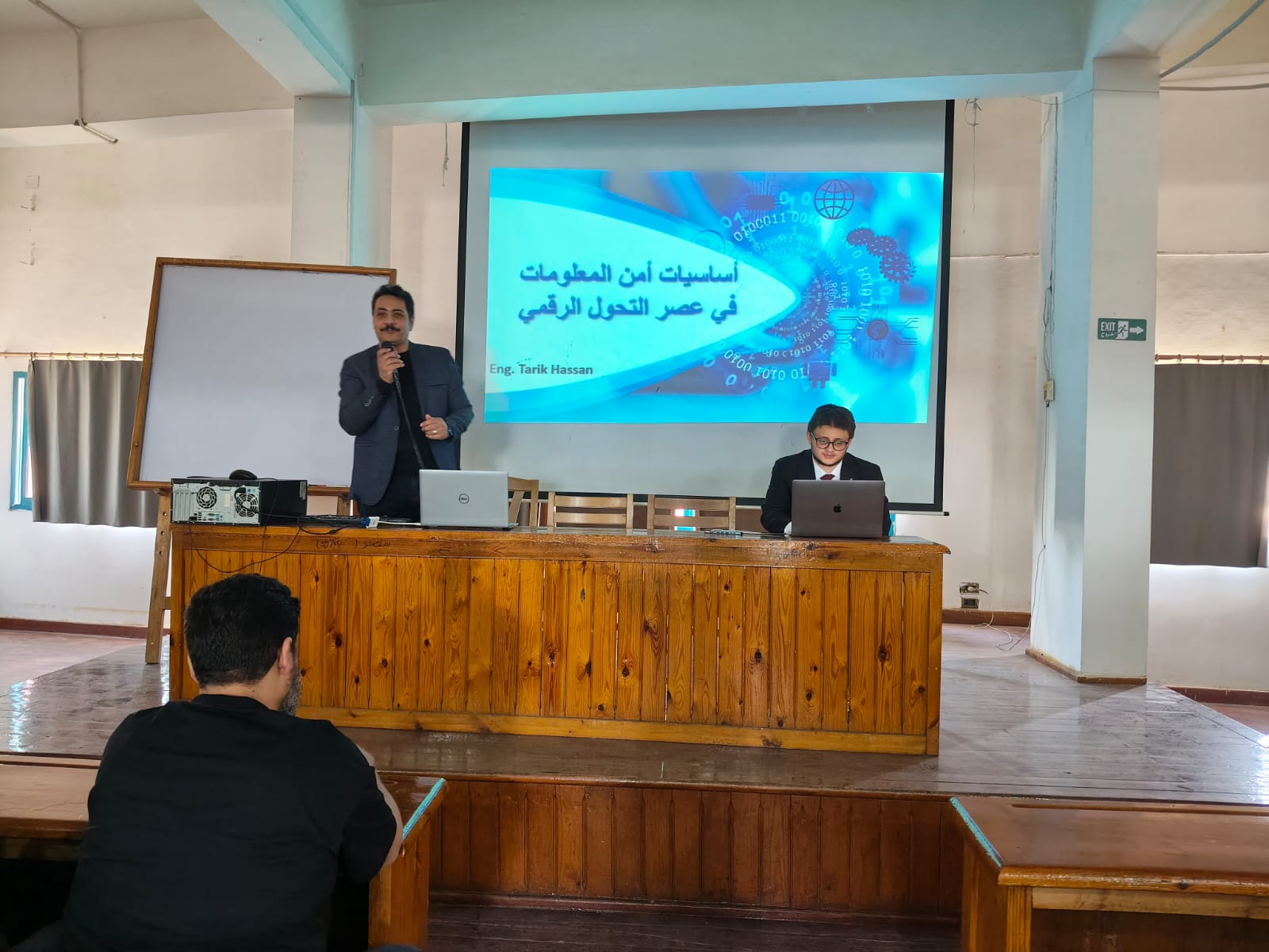 ثم تحدث م/ طارق حسن عن اساسيات أمن المعلومات في عصر التحول الرقمي وأهمية التحول الرقمي وتحدث عن وسائل التواصل الاجتماعي وأمن المعلومات وكيفية التحول للحياة الرقمية وتأثير التكنولوجيا الحديثة علي الحياة اليوميه وماهو أمن المعلومات وعن عناصر الحماية في امن المعلومات وأهمية أمن المعلومات في حياتنا اليوميه .